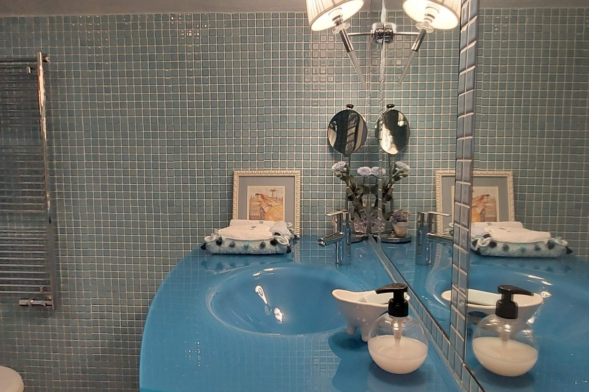 completo di sanitari, doccia e un ampio lavabo in vetro.