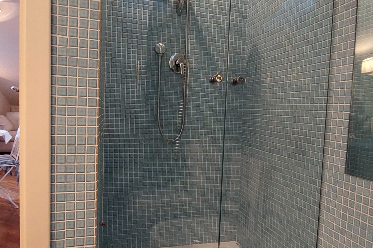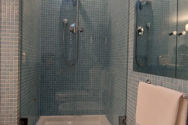 Il bagno di design, rivestito in moderni mosaici e inondato di luce naturale